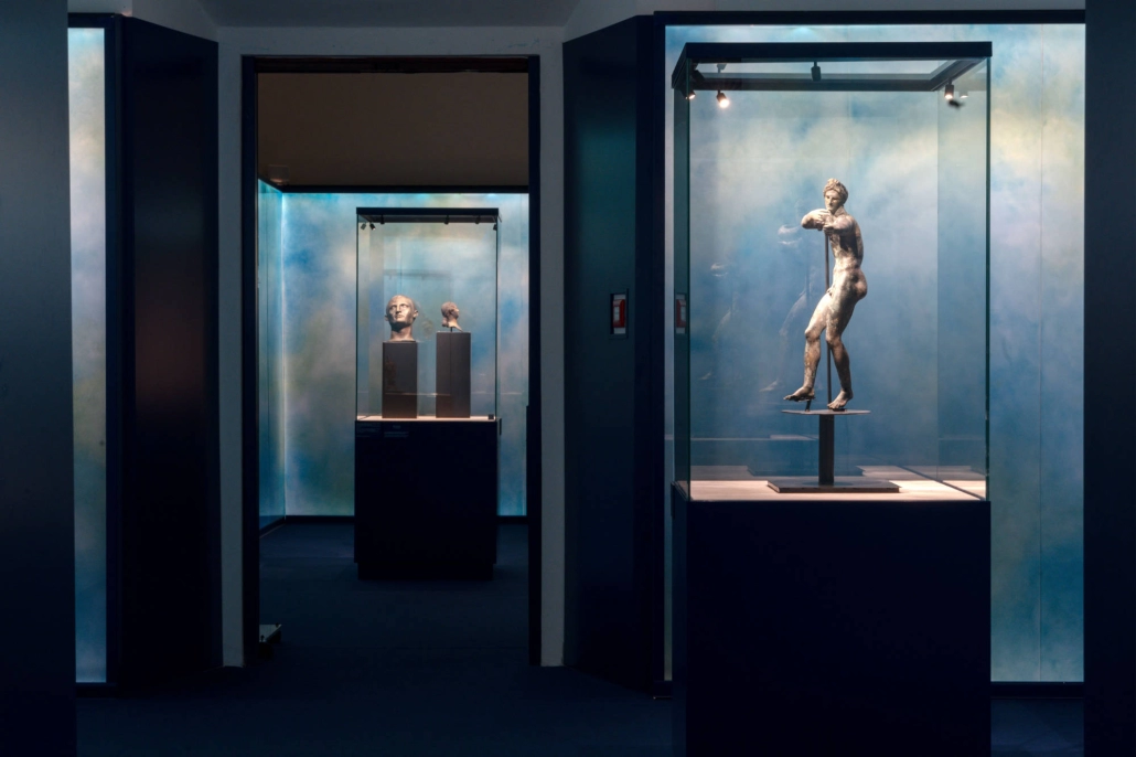La scenografia così realizzata – tra fondi acquatici, suoni evocativi e illuminazione morbida – ricrea un ambiente immersivo che, oltre a valorizzare l’intensità delle opere, permette al visitatore di immergersi temporalmente e spazialmente nel contesto in cui i Bronzi hanno abitato per secoli, vivendo un’esperienza fisica ed emotiva.