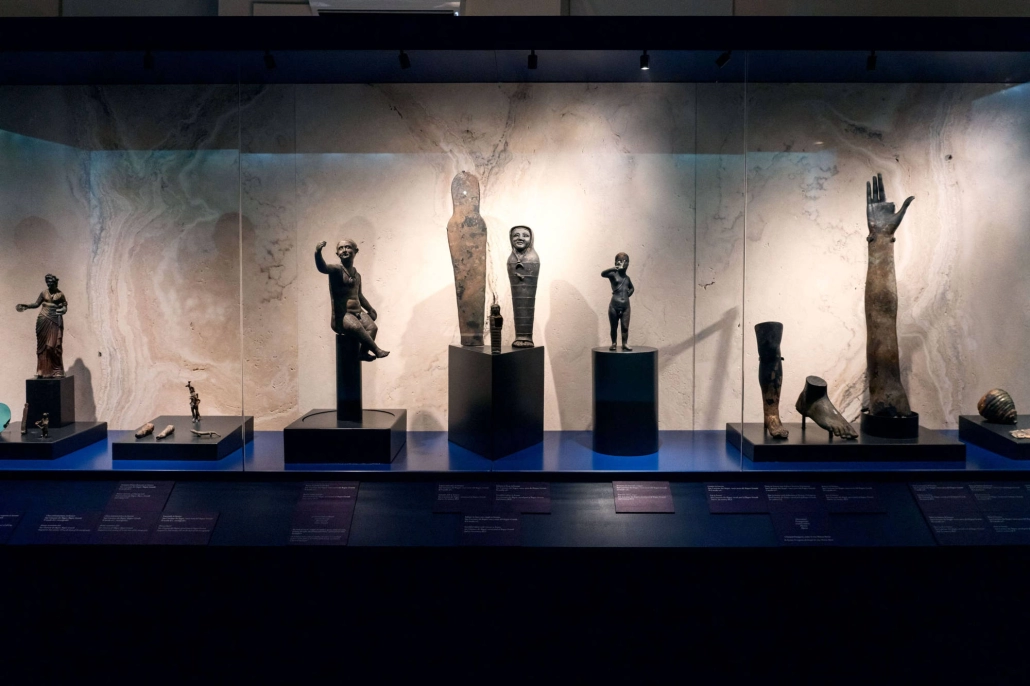 Protagoniste dell’esposizione sono venti statue e statuette, una selezione di monete in bronzo ed ex-voto, che raccontano una storia di devozione, di culti e di riti ospitati in luoghi sacri, dove l’acqua termale era usata anche a scopi terapeutici.