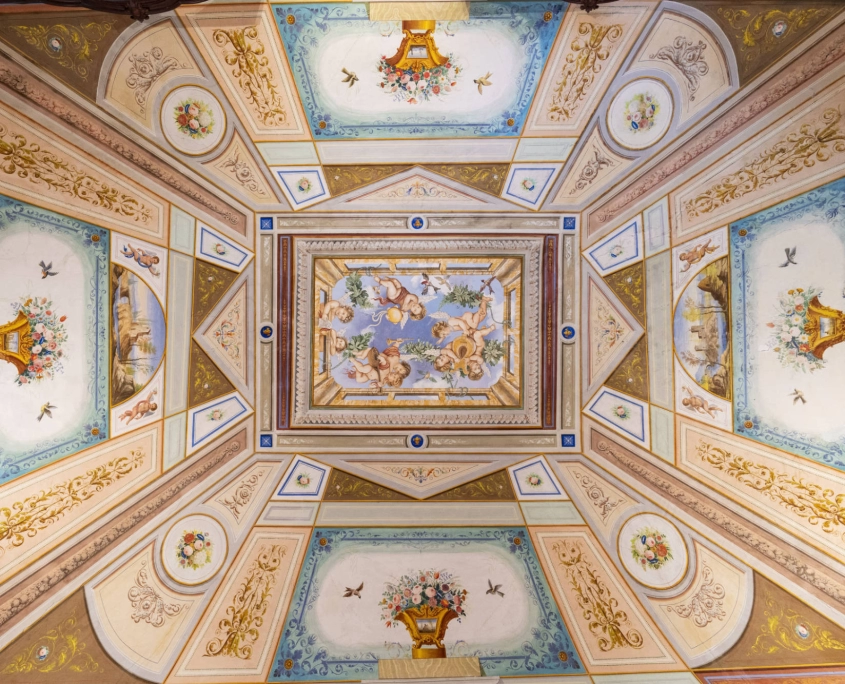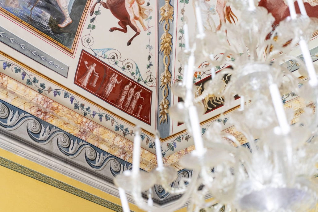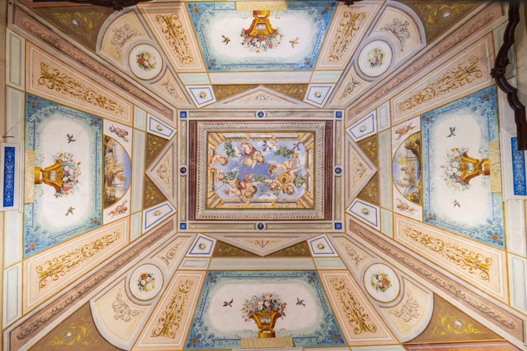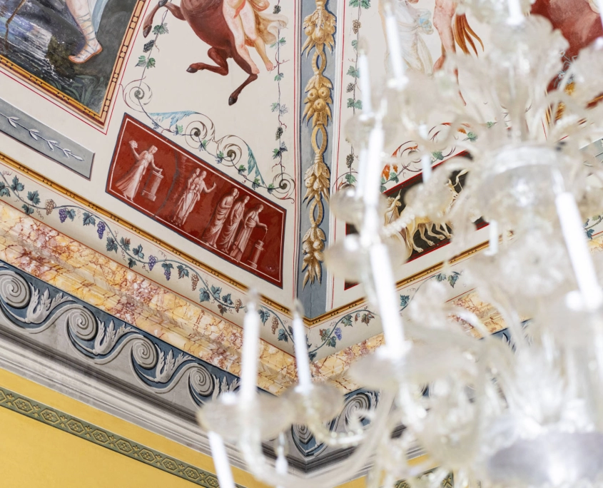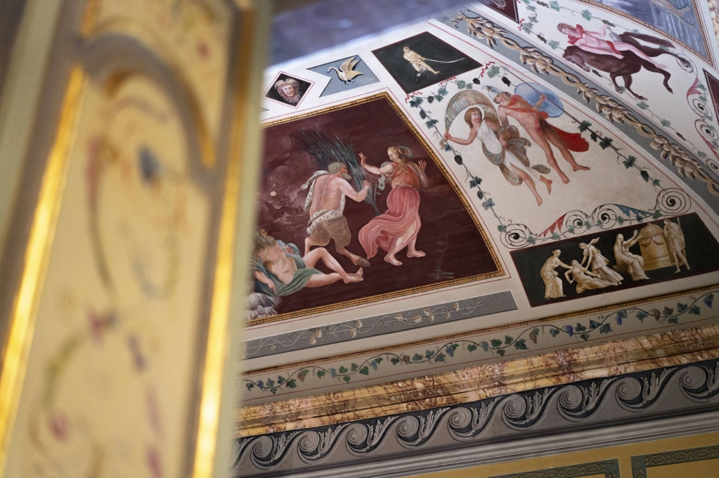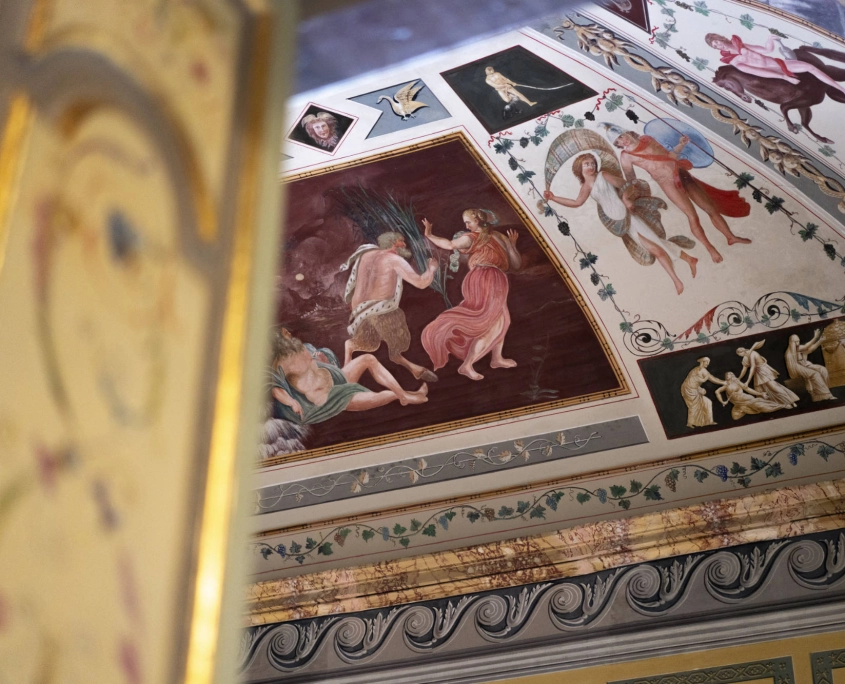 Gli ambienti sono stati rivestiti e isolati con tende mobili e leggere al tatto, a eccezione delle volte, che rimangono uno scenario ammirabile nel loro valore architettonico e artistico: una scelta che pone un’attenzione particolare all’edificio storico, concepito non solo come contenitore, ma anche come luogo con un proprio valore storico-artistico. I tendaggi fanno sì che l’occhio, all’altezza media, non abbia elementi di distrazione ma uno sfondo tessile che fa da quinta alle opere. L’ambientazione così ricreata è quella di una camera elegante e accogliente, che assieme all’illuminazione puntuale su teche e pannelli riconduce a una dimensione onirica: una culla per gli oggetti esposti.